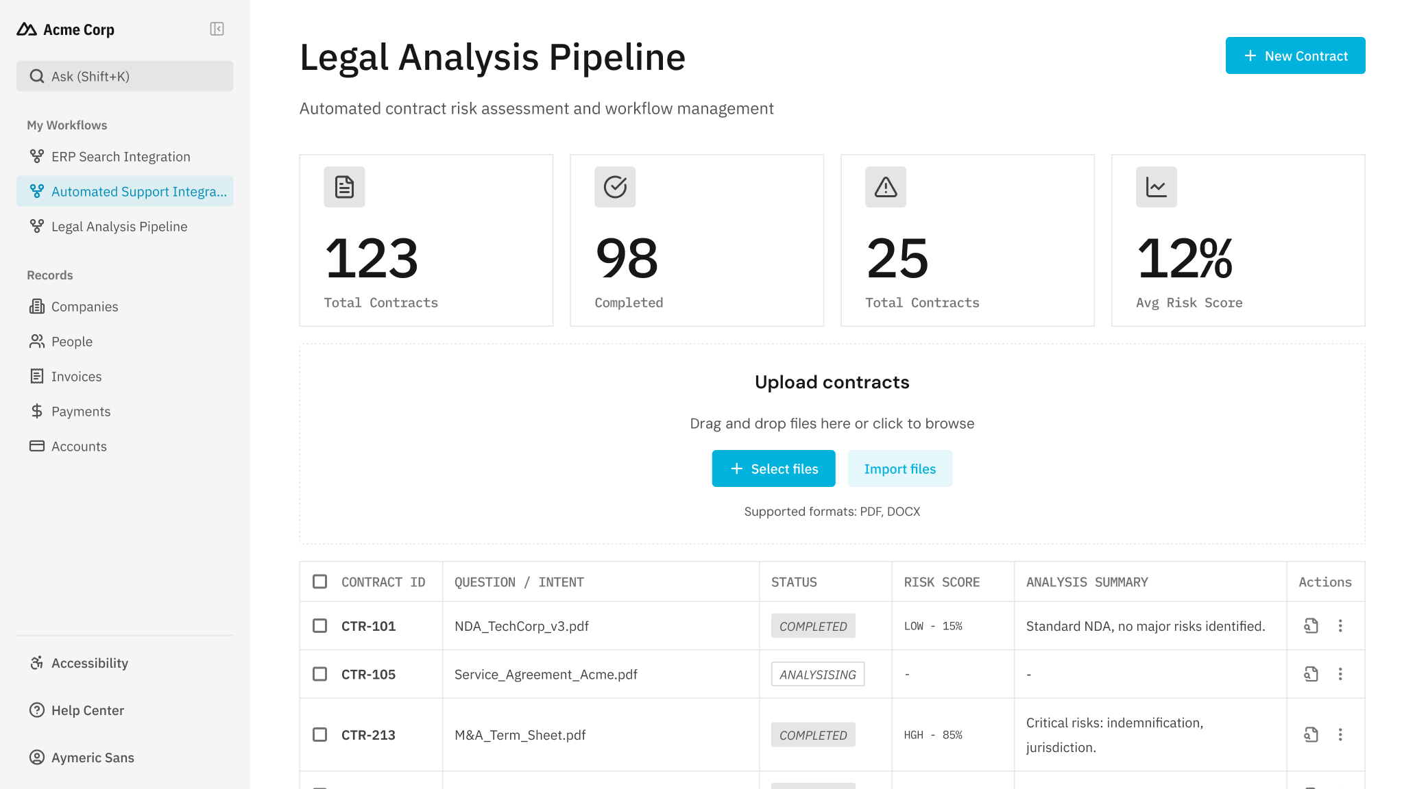 Functionality. Create a workflow that uploads contracts to a secure Workspace and triggers a risk analysis prompt automatically.