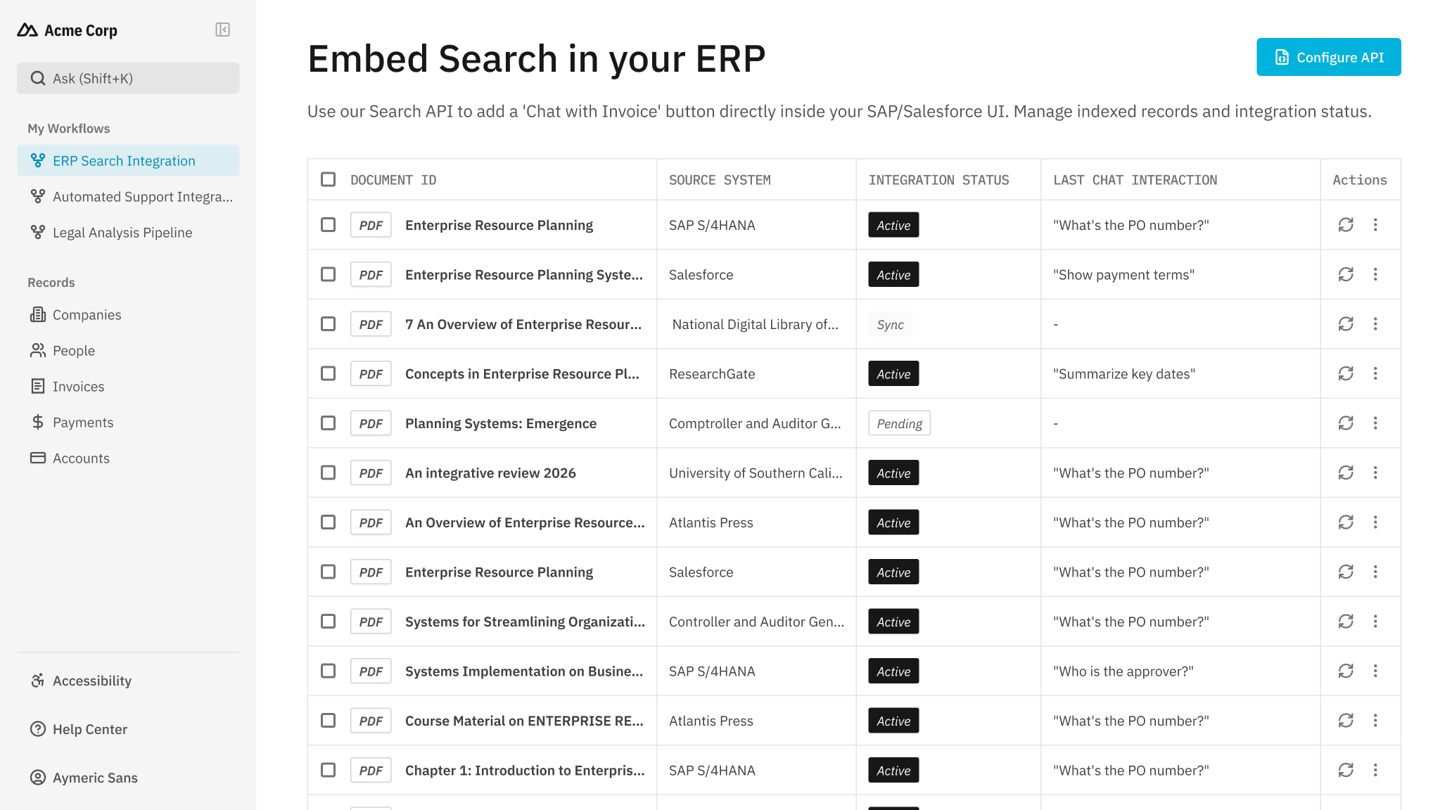 Functionality. Use our Search API to add a "Chat with Invoice" button directly inside your SAP/Salesforce UI.