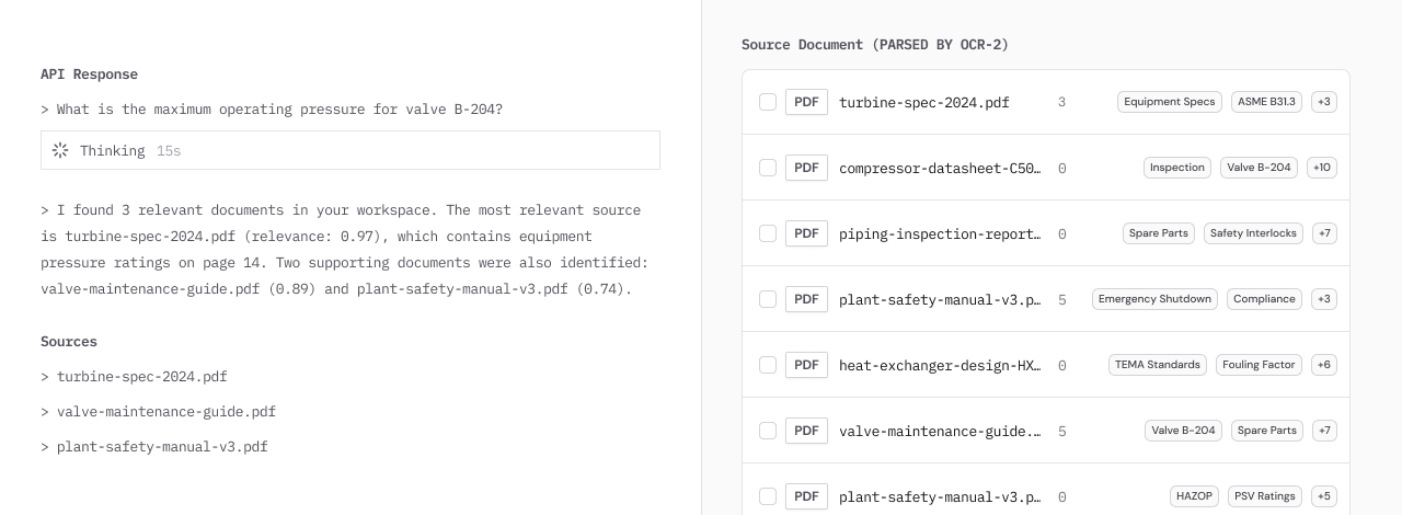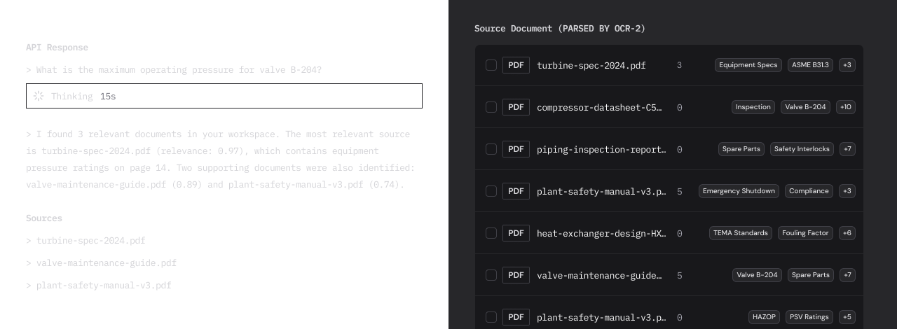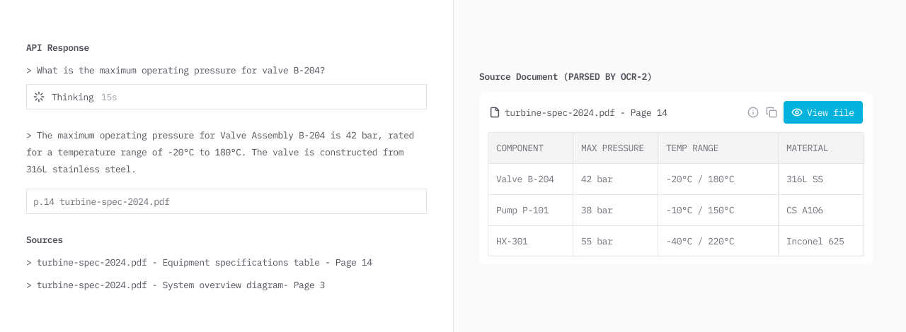 Integrate a production-ready Search & Reasoning engine via API. Give your software the power to find, extract, and reason across complex documents: diagrams, blueprints, financial tables where standard search breaks down.