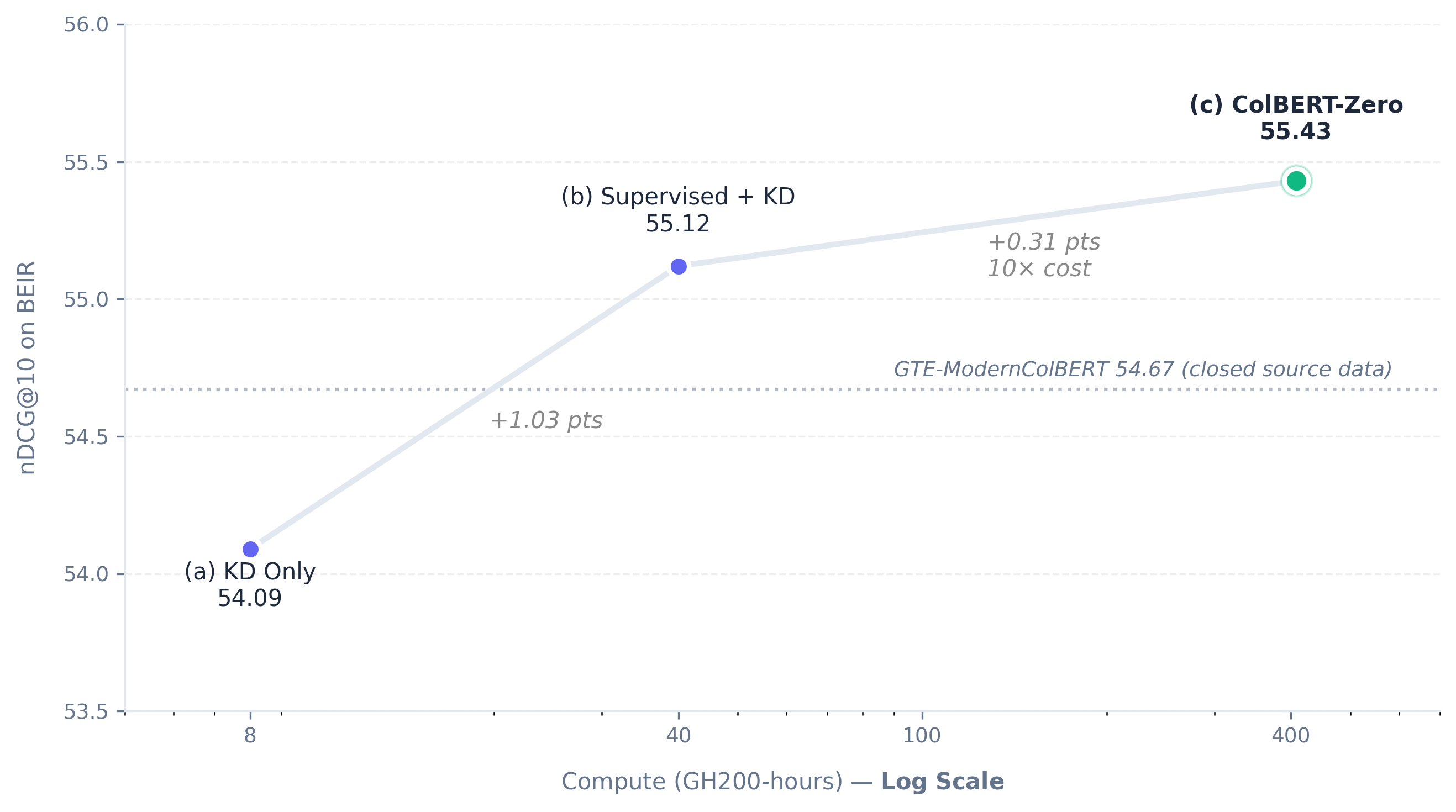 We investigated whether the gap could be closed without the expensive unsupervised phase. By running a supervised contrastive step in the multi-vector setting before distillation (pipeline (b) on the figure above), we observed a gain of over 1 point, reaching 55.12 nDCG@10. This effectively closes the gap with the fully pre-trained model (55.43), offering a highly efficient alternative that skips the most computationally intensive training stage while retaining nearly all the performance benefits. This costs ~40 GH200-hours instead of ~408: roughly 10Ă— cheaper for 99.4% of the performance.