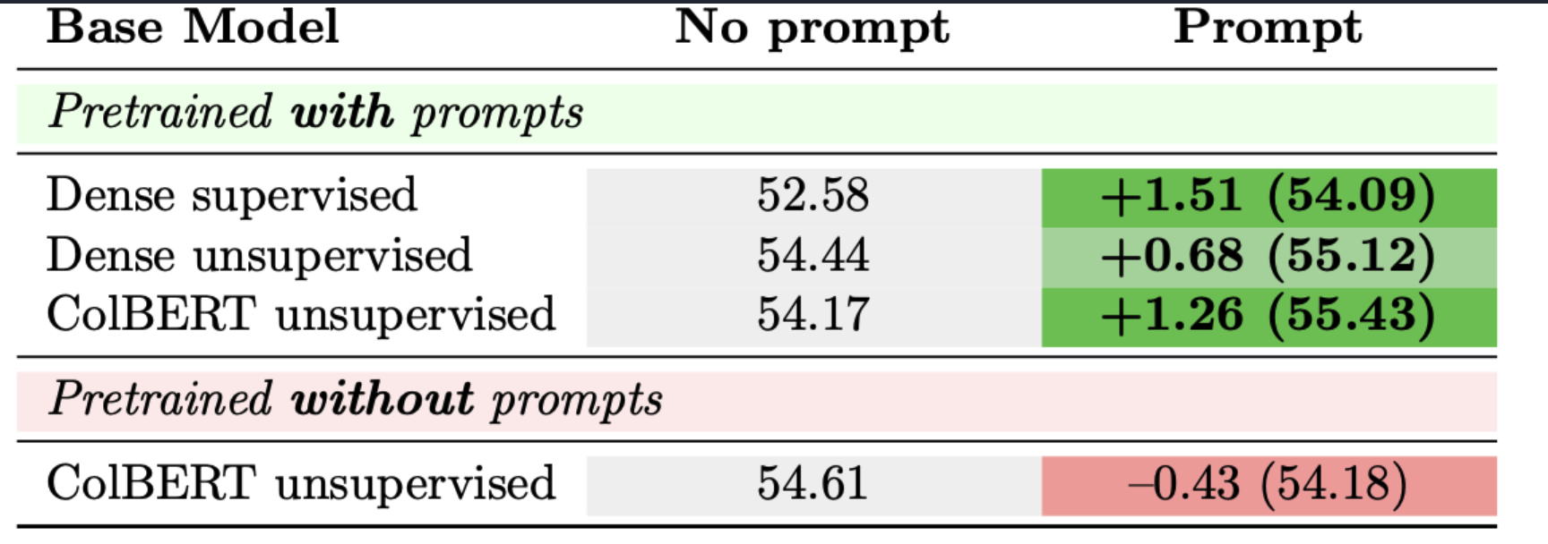 But alignment alone doesn’t explain everything. Even when comparing apples to apples, that is, full ColBERT pre-training with prompts vs. without prompts, no mismatch, we still observe a meaningful gap (54.61 vs. 55.43 nDCG@10). This suggests prompts provide an intrinsic benefit in their own rights