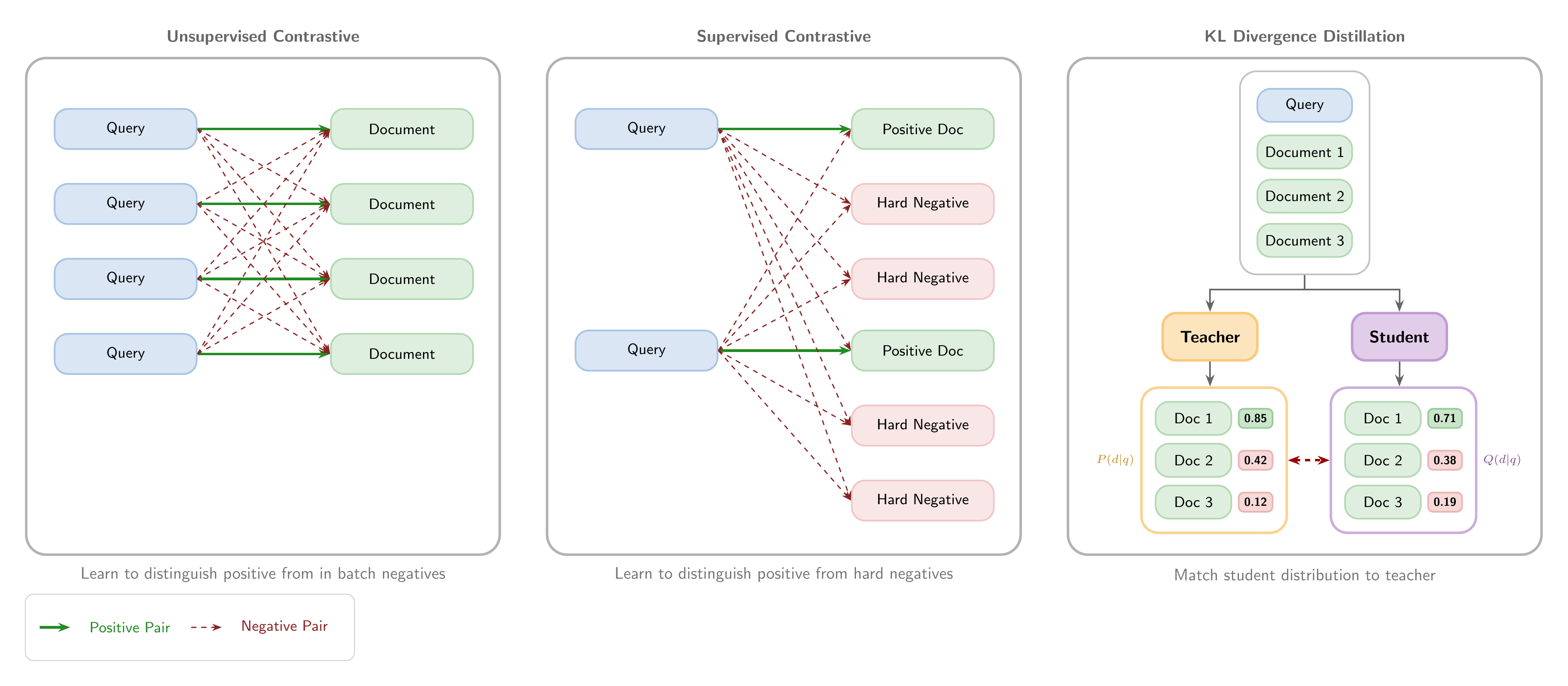 Training a strong retrieval model typically involves three distinct phases, each providing a different type of learning signal. Understanding them is key to following our experiments: