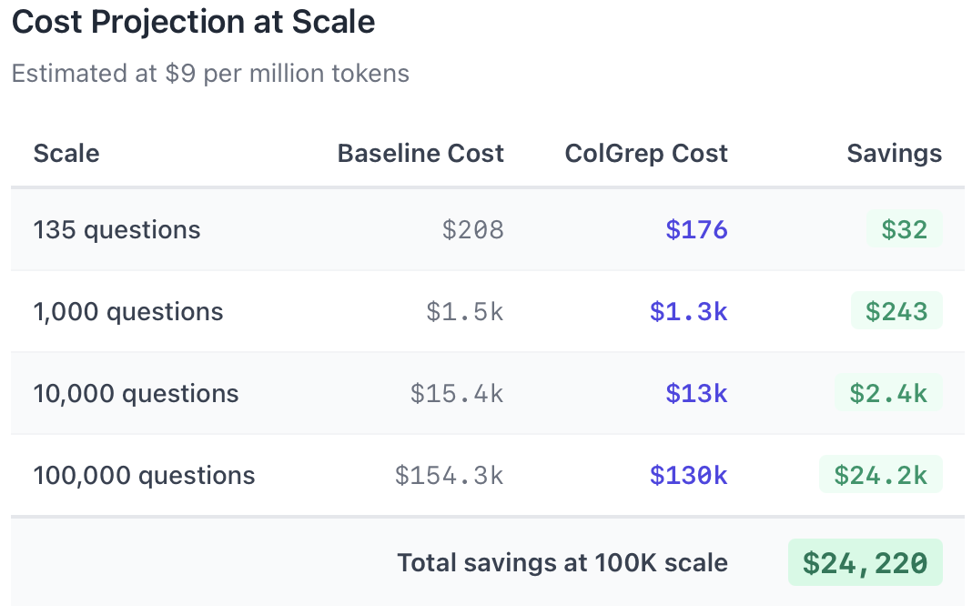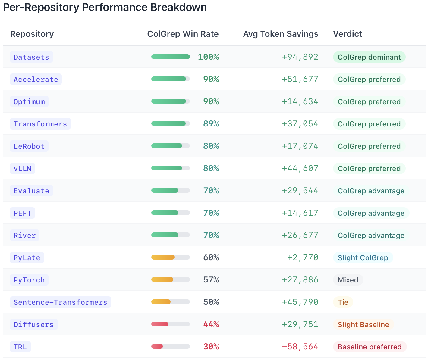 - Significant Cost Savings: Integrating ColGrep reduced token usage by an average of 60,000 tokens per complex query by providing surgical precision to the AI assistant.
