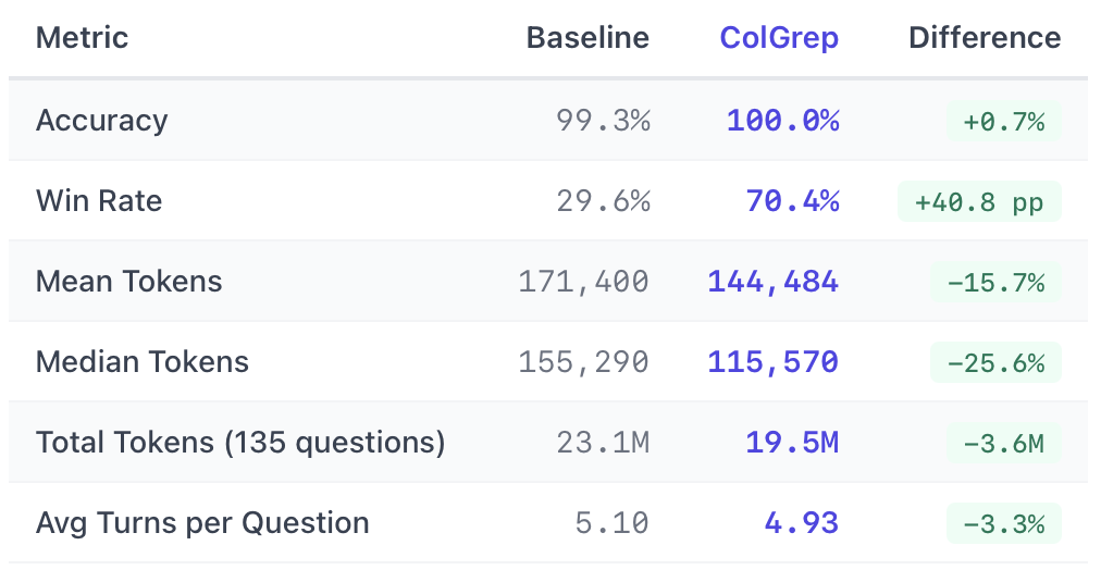 ColGrep reduces the number of search operations required to answer a question. Baseline agents issue grep and glob commands repeatedly, refining patterns until they find what they need. ColGrep typically returns useful results on the first or second query. ColGrep requires 56% fewer search operations than baseline. This efficiency compounds: fewer searches mean fewer tool calls, fewer tokens spent on intermediate results, and faster convergence to the answer.