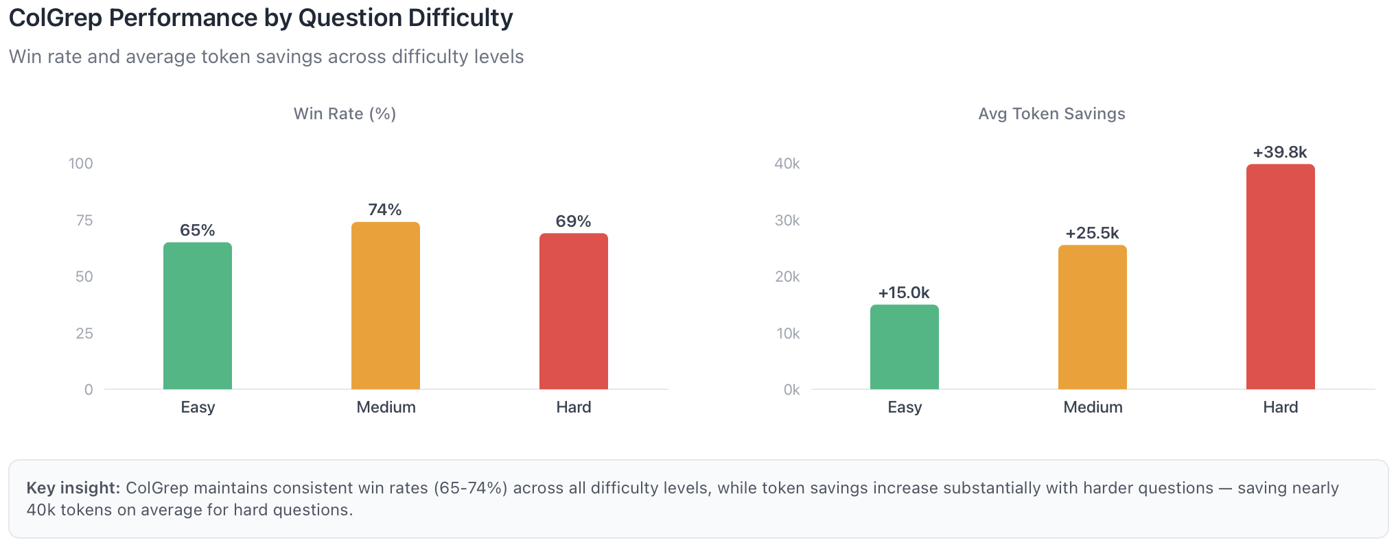 Harder questions show larger gains. On easy questions, ColGrep wins 65% of the time with modest savings. On hard questions, the win rate is 69% but the average savings nearly triple. This pattern makes sense. Easy questions often have direct keyword matches. Hard questions describe functionality in natural language, which is exactly what semantic embeddings capture.