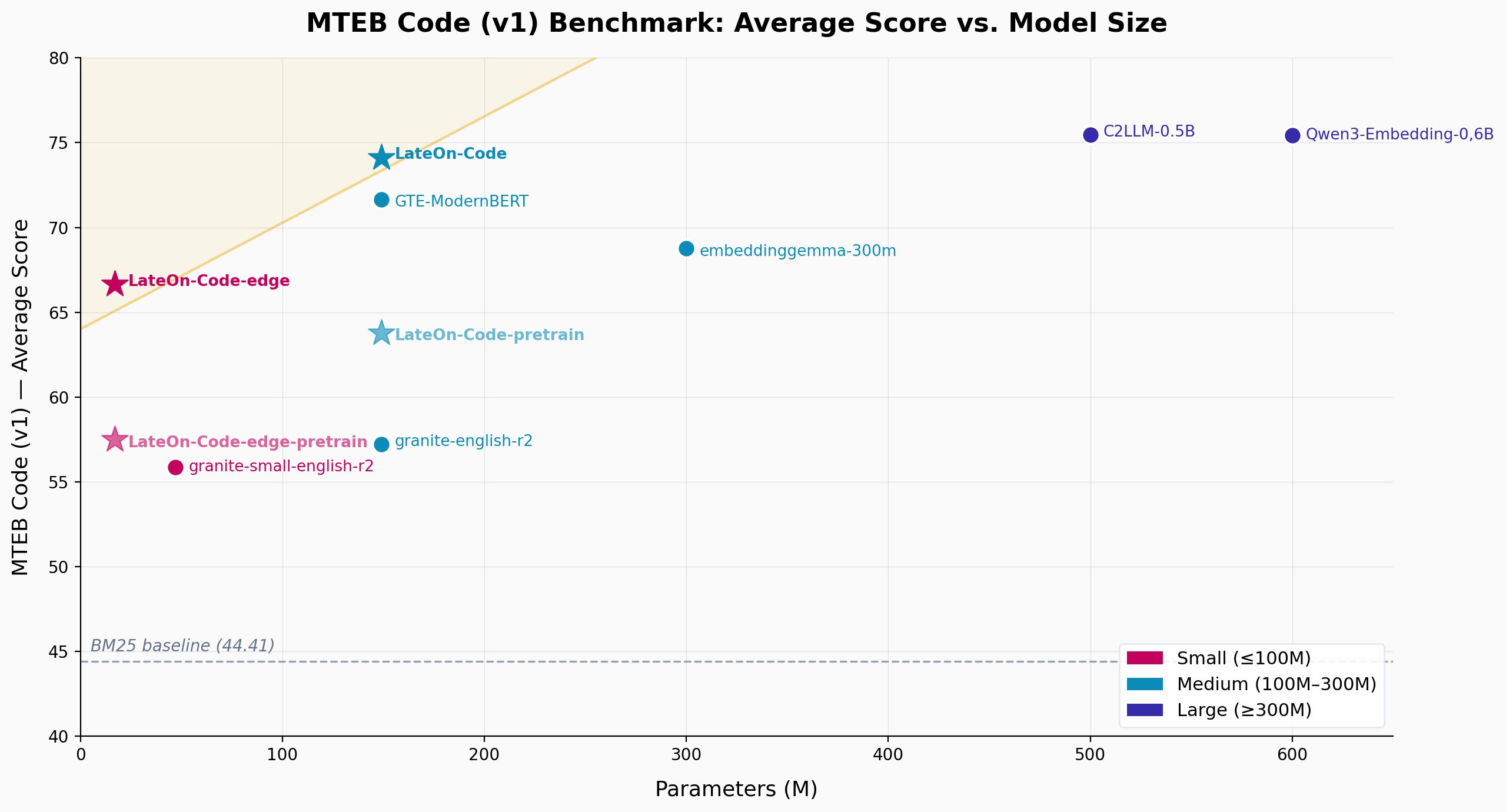 The pre-trained LateOn-Code-edge beats granite-embedding-small-english-r2 by 1.7 on average, despite being almost three times smaller (17M vs 48M). Even more impressively, it also outperforms the larger granite variant (149M). The first model on the leaderboard to actually surpass it is EmbeddingGemma-300M, a very strong model 17 times its size.