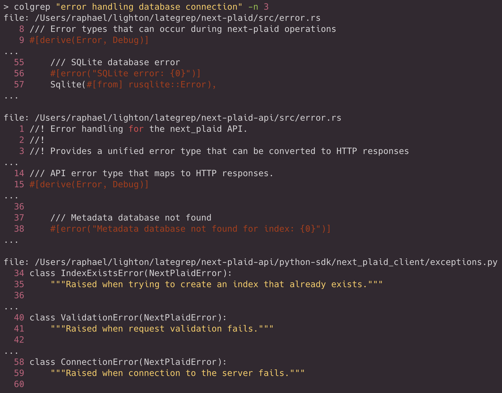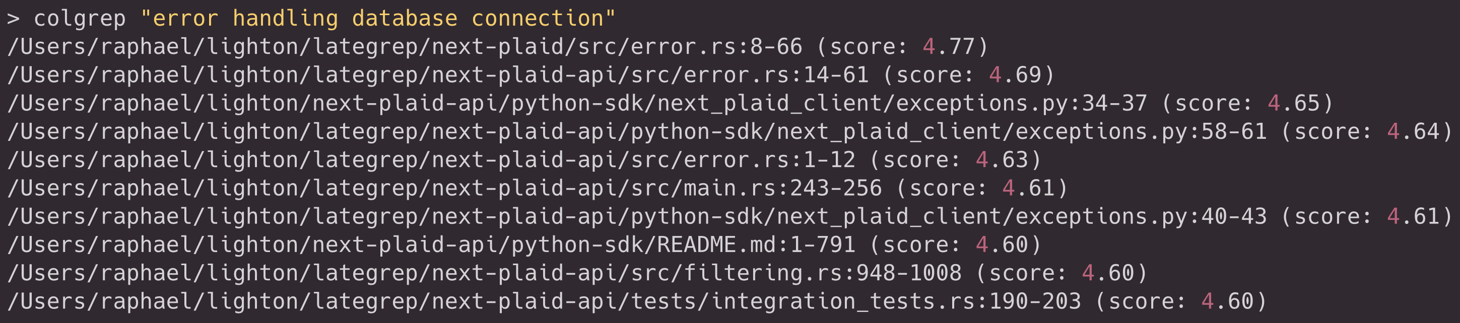 ColGrep is our answer. It is a Rust command-line program that reproduces the grep interface agents already know, but augments it with the semantic and intent-detection capabilities of late-interaction models. Powered by LateOn-Code and Next-Plaid, our multi-vector database written in Rust, ColGrep runs entirely locally: no remote storage, no separate API service, and fast incremental index updates triggered by any file change. It is specifically designed for coding agents such as Claude Code, OpenCode, or Codex, which search for relevant implementation details before proposing edits or generating patches. Crucially, ColGrep also supports hybrid queries: agents can apply regex constraints first, exactly as they would with grep, and then let the semantic model rank the filtered results by intent, getting the best of both worlds.