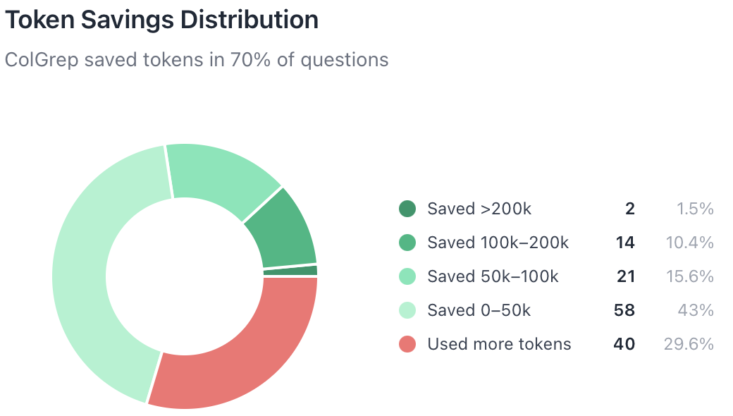 Not every question produces massive gains. ColGrep saved tokens in 70% of questions. The wins concentrate in the moderate savings bracket (0–50k), but the large wins (>50k) account for 27.5% of cases and drive most of the aggregate benefit.